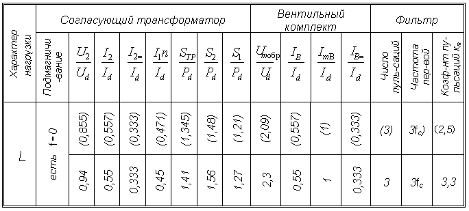 Для выбора основных элементов силовой схемы (трансформатора, тиристоров) управляемого выпрямителя воспользуемся расчетными соотношениями (таб. 1).