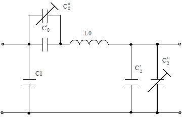 Для настройки контура в резонанс и обеспечения оптимальной связи с нагрузкой в состав емкостей С0 и С2 целесообразно включить подстроечные конденсаторы. При включении в цепь подстроечных конденсаторов схема контура примет вид изображенный на рисунке 10.