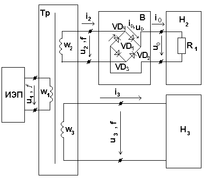 В данной курсовой работе представлен расчет однофазного низковольтного силового трансформатора малой мощности как структурного элемента источника вторичного электропитания, работающего в длительном режиме. Трансформатор имеет ряд обмоток. Первичная обмотка с числом витков w1 подключена к источнику электропитания, вырабатывающему переменное синусоидальное напряжение U1 и частотой 400 Гц. С двух групп вторичных обмоток с числами витков w2 и w3 снимаются переменные напряжения соответственно U2 и U3 той же частоты. Вторичная обмотка с числом витков w2 через соответствующий нерегулируемый выпрямитель В и выпрямленное напряжение U0 , снабжает электроэнергией нагрузку H3 , имеющую чисто активный характер, требующую питание постоянным током. Однофазная вторичная обмотка с числом витков w3 подключена непосредственно к нагрузке H3 , получающей питание переменным током, частота которого совпадает с частотой источника. На рис. схемы протекают следующие токи: i1 – переменный ток, потребляемый первичной обмоткой трансформатора; i2 - переменный ток в фазе вторичной обмотки с числом витков w2 ; i0 – постоянный по направлению и пульсирующий по величине (выпрямленный) ток, питающий нагрузку H3 ; i3 – переменный ток, протекающий во вторичной обмотке с числом витков w3 и нагрузке H3 .