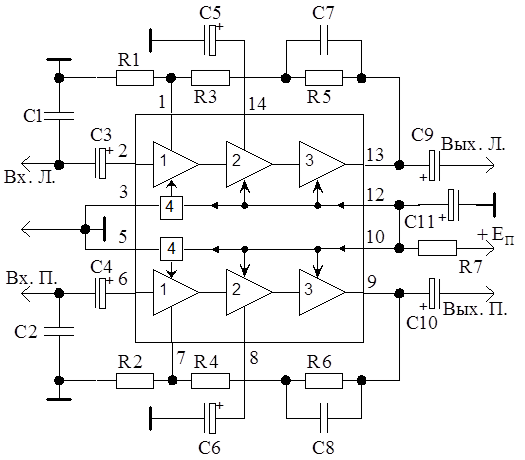 Коэффициент усиления определяется при этом сопротивлением внешнего резистора, включенного между выводами 1, 3 (7, 5 для второго канала) и параметрами цепи ООС. Для получения максимального усиления основного усилителя и устранения уменьшения усиления на низших частотах между выводами 14, 3 (8, 5) включают конденсатор большой ёмкости (при стандартном включении этой микросхемы в качестве УВ кассетного магнитофона ёмкость этого конденсатора выбирают равной 100 мкФ и номинальное напряжение этого конденсатора выбирается равным 15 В при напряжении питания микросхемы