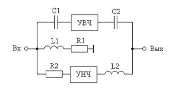 При разработке усилителей с рабочими частотами от нуля либо единиц герц до единиц гигагерц возникает проблема совмещения схемных решений построения низкочастотных и сверхвысокочастотных усилителей. Например, использование больших значений разделительных конденсаторов и дросселей питания для уменьшения нижней граничной частоты, связано с появлением некорректируемых паразитных резонансов в области сверхвысоких частот. Этого недостатка можно избежать, используя частотно-разделительные цепи (ЧРЦ). Наибольший интерес представляет схема усилителя с ЧРЦ, предназначенного для усиления как периодических, так и импульсных сигналов [15,16,17]. Схема усилителя с ЧРЦ приведена на рис. 8.1, где УВЧ – усилитель верхних частот, УНЧ – усилитель нижних частот.