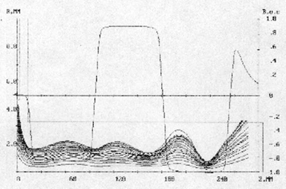 Путь увеличения толщины полюсных наконечников с целью снижения индукции в перемычках увеличивает протяженность зоны реверса и требует существенного изменения конструкции прибора. В связи с этим в дипломе улучшение структуры формируемого пучка достигается за счет уменьшения амплитуды используемого магнитного поля. Вернемся к варианту ЭОС представленному на рис.2.5, но магнитное поле во втором реверсе уменьшим на 100 Гс. Результаты расчета такой ЭОС вверху на плакате 5 (рис.2.7). Сравнивая этот рисунок с рис.2.5 находим, что уменьшение амплитуды магнитного поля несколько улучшило фазу влета пучка в область второго реверса и уменьшило радиус пучка в третьей области.