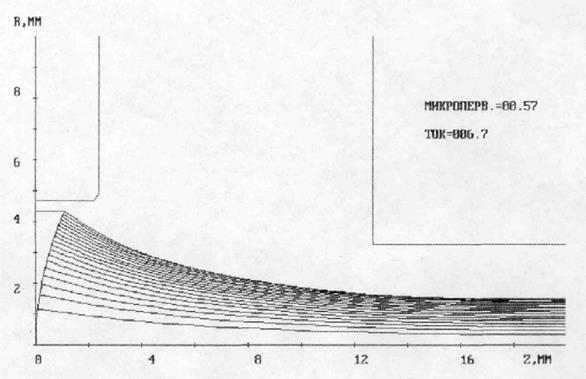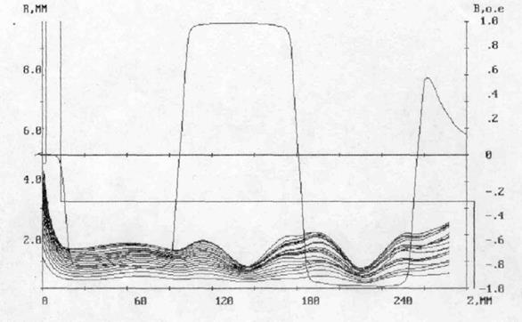Из этого рисунка следует, что максимального значения радиус электронного потока достигает в выходной части прибора и составляет 2,7 мм. Поскольку радиус пролетной трубы клистрона равен 3,25 мм, то максимальное значение коэффициента заполнения канала пучком (b), по результатам расчета, равно 0,875. Такое значение коэффициента заполнения является недопустимо высоким. В связи с этим встает задача оптимизации данной ЭОС с целью уменьшения радиуса формируемого пучка. Как видно из этого рисунка имеются две причины увеличения радиуса пучка в выходной части прибора.