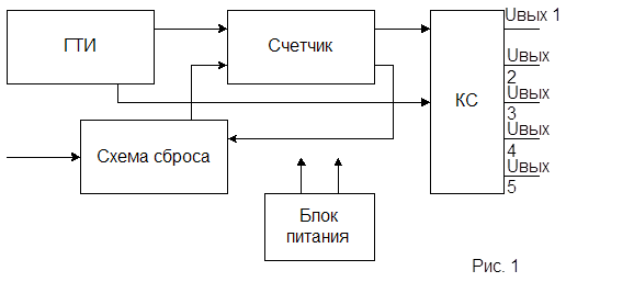 Принцип работы синтезируемого устройства заключается в следующем: С генератора тактовых импульсов (ГТИ) импульсы заданной частоты (19 МГц) поступают на счетную схему (Сч). Последовательность работы счетной схемы соответствует заданию, т.е. счетчик считает поступающие тактовые импульсы до 30, затем происходит сброс счетчика в нулевое состояние и счет повторяется заново. Со счетной схемы сигналы поступают на комбинационную схему (КС). Данный преобразователь (комбинационная схема) формирует на пяти выходах заданные последовательности импульсов. После 30 тактовых интервалов счетчик обнуляется, на выходе появляется первое значение последовательности и период выходных импульсов повторяется.