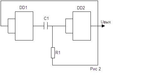 Принцип работы приведенной выше схемы наглядно демонстрирует временная диаграмма. Разрабатываемый мультивибратор в автоколебательном режиме. В те моменты времени, когда напряжение на входе DD2 достигает порогового значения схема переводится в противоположное состояние и на выходе изменяется состояние с 0 в 1 или наоборот. Время нахождения схемы как в одном, так и в другом состоянии определяется параметрами элементов времязадающей RC – цепочки.