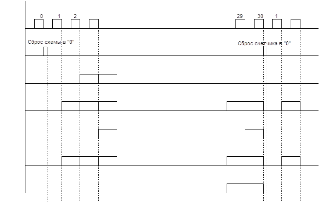 Синтезируемая схема должна содержать: генератор тактовых импульсов, счетную схему считающую с периодом 30 тактовых импульсов, комбинационную схему.