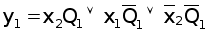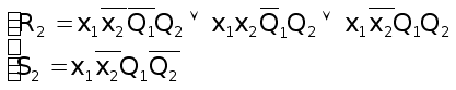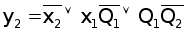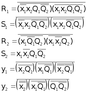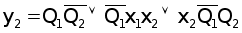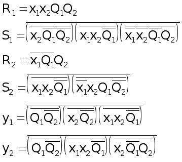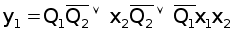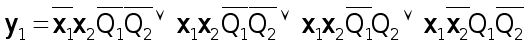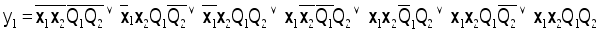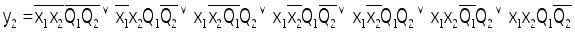 5. По таблицам выходов составляем уравнения логических функций для выходных сигналов y1 и y2, учитывая, что в каждой клетке левый бит – y1, а правый бит – y2.