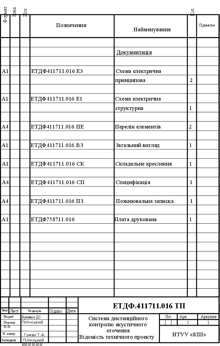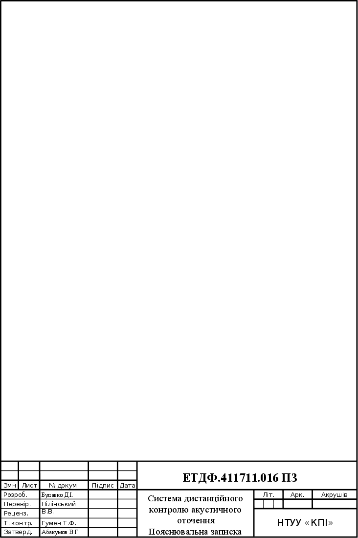 Представлений на рецензію дипломний проект студента Булавка Дмитра Ігоровича. на тему «Система дистанційного контролю акустичного оточення» складається з пояснювальної записки 84 сторінок формату А4 та 6 креслень формату А1. та є конструкторською документацією на розроблений прилад, що здійснює спектральний аналіз рівня звукового тиску з частотною корекцією та без неї.