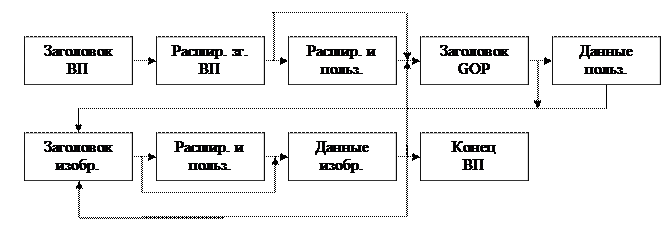 Как уже было сказано, представление сигналов в форме MPEG-2 позволяет обращаться с видео и звуковыми потоками как с потоками компьютерных данных. Поток видеоданных представляет собой иерархическую структуру, объединенную между собой определенными синтаксическими и семантическими правилами. Структура включает в себя шесть типов блоков: