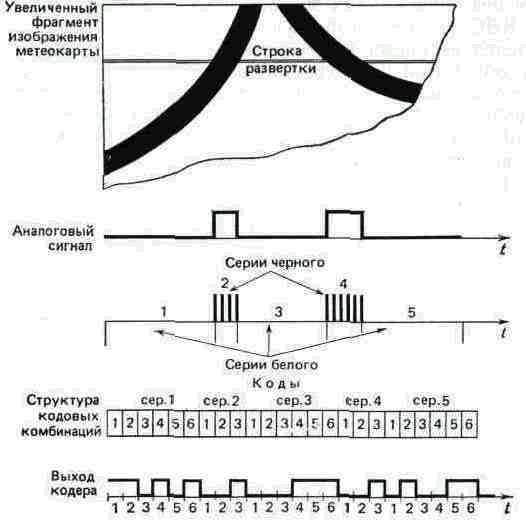 Якщо ж у зображенні зустрічаються довжини, більші чим 63 чи 7 елементів (для чорних серій), то регулярність чергування кодових комбінацій порушується і для правильного прийому необхідно використовувати службові кодові комбінації, що розділяли б відповідні кодові слова (рис. 3.2). При передачі метеокарт подібний спосіб кодування практично дозволив одержати коефіцієнт стискання до 80%, тобто приблизно на 80% зменшується загальна кількість переданих двійкових чисел.