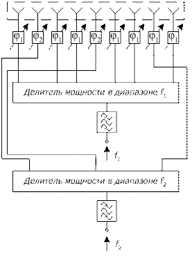 В совмещенных двухчастотных ФАР питание излучателей и включение фазовращателей в каждом частотном диапазоне, как правило, независимы и реализуются в соответствии с принципами построения фидерного тракта обычных одночастотных ФАР [0.2].