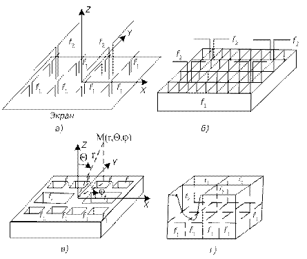В примерах построения совмещенных апертур двухчастотных ФАР (рис. 4.2} около каждого излучателя обозначена средняя частота f1 или частота f2 рабочего диапазона, в котором он проявляет себя как активный излучатель. В качестве излучателей обоих диапазонов в ФАР, изображенной на рис. 4.2, а, используют резонансные (на рабочей частоте) вибраторные излучатели, расположенные над отражающим экраном. Причем для наименьшего затенения, как правило, излучатели более низкочастотного диапазона располагаются над излучателями более высокочастотного.