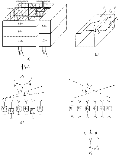 а) - для полноводно-вибраторной (БВИ - блок волноводных излучателей, БФЧ f1(f2) - блок фазирования на частоте f1(f2), ВДМ - волноводный делитель мощности на частоте f1, ДМ - коаксиальный или полосковый делитель мощности на частоте f2);
