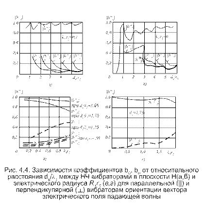 Анализ рис. 4.4 показывает, что с увеличением расстояния dx/l1 между соседними вибраторами в НЧ ФАР по сравнению с длиной волны ВЧ ФАР, что эквивалентно увеличению отношения рабочих часто f1/f2, уровень дополнительных боковых лепестков и снижение КУ уменьшаются, а с увеличением электрической толщины вибраторов k1r2 - увеличиваются. Кроме того, искажения, вносимые излучателями НЧ ФАР в поле ВЧ ФАР, гораздо меньше при взаимно ортогональной линейной поляризации излучателей ВЧ и НЧ ФАР. Следует отметить, что (4.1), (4.3) - (4.5) не учитывают влияния системы питания и крепления НЧ вибраторов на рассеяние поля ВЧ ФАР. Последнее особенно заметно проявляется при взаимно ортогональной поляризации в диапазонах f1 и f2. При этом (4.1), (4.3) - (4.5) могут давать несколько заниженные оценки искажений в ВЧ диапазоне.