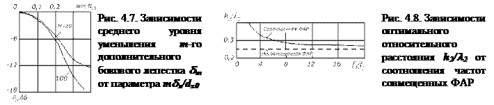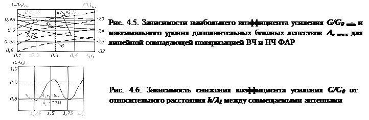 С учетом (4.6) получаем следующие простейшие оценки огибающих наибольшего снижения КУ (G/G0)min в разах и максимального уровня дополнительных боковых лепестков (Δn)max в децибелах для линейной совпадающей поляризации ВЧ и НЧ ФАР: