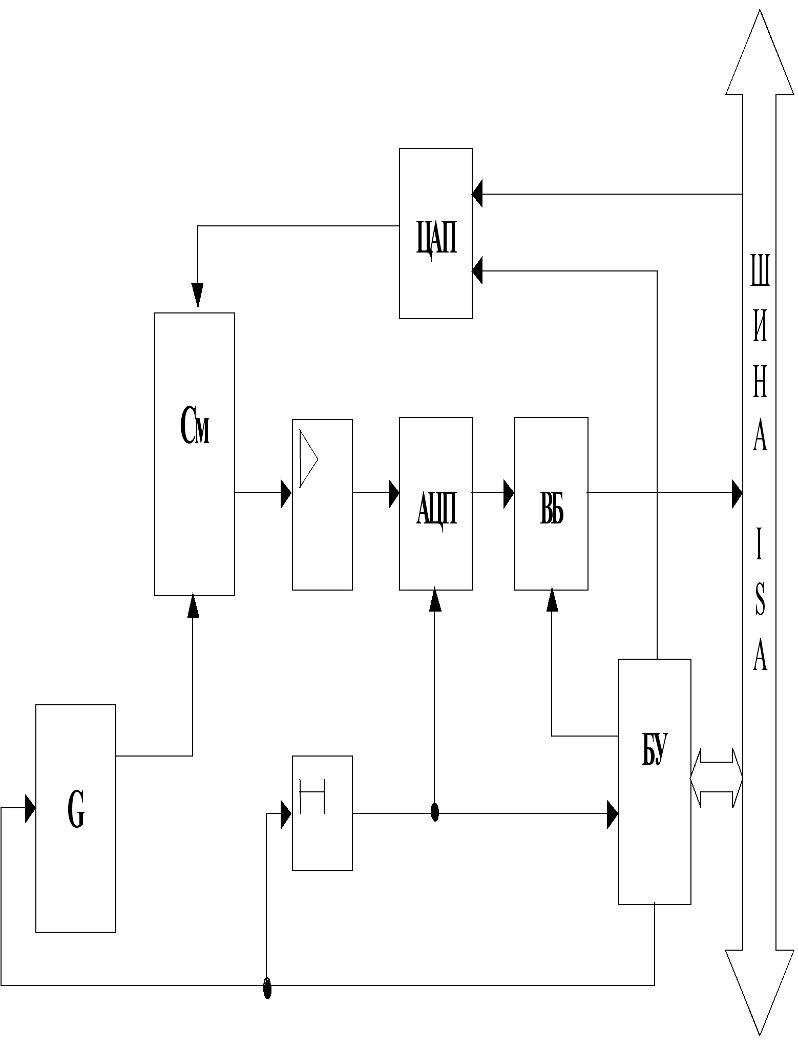 В приложении приведена принципиальная схема канала стробоскопического АЦП с интерфейсной частью. Наиболее ответственным узлом преобразователя, определяющим его метрологические характеристики, является стробоскопический смеситель. С выхода усилителя DA1 выборка входного сигнала поступает на вход дополнительного быстродействующего усилителя К1420УД1. Применение повторителя на мощном полевом транзисторе VT1 необходимо для увеличения нагрузочной способности схемы. Преобразование амплитуды сигнала выборки в цифровой код осуществляется DD13 – схемой параллельного АЦП К1107ПВ3, позволяющего непосредственно измерять сигналы амплитудой до 2.5 В. Запуск АЦП осуществляется от формирователя импульсов на микросхеме DD14 . По фронту импульса происходит считывание и преобразование в код входного сигнала, по срезу – запоминание полученного результата на выходе схемы. Задержка импульса запуска параллельного АЦП на 150200 нс по отношению к моменту запуска генератора строб импульсов DA2, необходимая для установления сигналов на выходе усилителя выборки DA1, обеспечивается схемой DD6, DD7, построенной на базе дифференциальных приемников К500ЛП114. Использование пяти последовательно включенных каскадов задержки, два из которых охвачены цепью положительной обратной связи для обострения фронтов импульса запуска АЦП, позволяет получить достаточно высокую стабильность времени задержки и соответственно малую апертурную неопределенность. Код с выхода АЦП DD13 через схемы преобразователей уровня DD20, DD21 поступает на схему выходного буферного устройства DD22, DD23. Информация из буферного устройства в ЭВМ вводится по сигналу Считывание, поступающему от блока управления при обращении по соответствующему адресу. При этом содержимое разрядов 0 4 с выхода АЦП поступает соответственно на разряды к DA0 DA4 канала МПИ, содержимое пятого разряда с выхода АЦП поступает на седьмой (знаковый) разряд шины данных МПИ, а из разряда переполнения АЦП поступает к D5 МПИ. Такая организация выхода АЦП позволяет упростить обработку информации в ЭВМ.