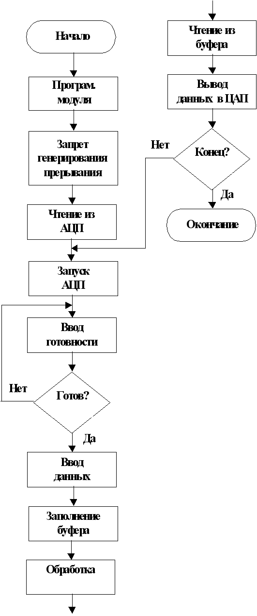 4.1.1. Функции, выполняемые модулем, состоят в приеме данных, снятых со стробоскопического АЦП. После принятия данных из АЦП генерируется сигнал готовность и интерфейсная часть должна сгенерировать сигнал прерывания, говорящего о том, что данные готовы к пересылке из модуля в ЭВМ. Номер прерывания задается распайкой перемычек в наборном поле блок элементов. В наборном поле осуществляется выбор из 5,10 или 11 прерывания. Существует возможность маскирования выданного прерывания путем выдачи в порт маски. В таком случае чтение готовности осуществляется программно. После соответствующего анализа введенных данных для создания обратной связи должно выдаваться слово в порт для цифроаналогового преобразователя. После включения питания модуля для избежания попадания ложных данных рекомендуется произвести чтение из порта по адресу 14301h.