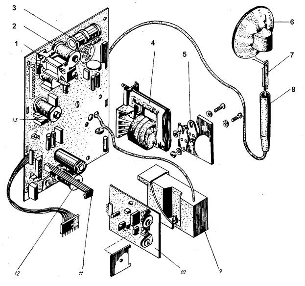 1 - регулятор линейности РЛС-4 ( L2); 2 - дроссель ДРТ-1 ( L1); 3 - регулятор центровки по горизонтали ( R2 ) ; 4 - трансформатор выходной строчный ТВС-110ПЦ15 ; 5 - транзистор КТ838 с радиатором ; 6 - колпачок высоковольтный ; 7 - планка с ограничительным резистором R24; 8 - наконечник ; 9 - умножитель напряжения УН9 / 27-1 ,3; 10 - субмодуль коррекции растра СКР-2 ; 11 - стойка ; 12 - дроссель ДРТ-1 ; 13 - трансформатор ТМС-21