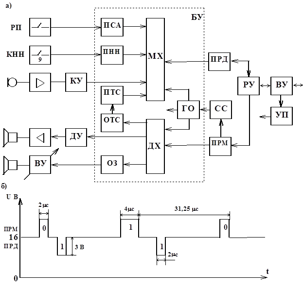 Рис. 1. а) Структурная схема цифрового телефонного аппарата , б) Временные диаграммы , поясняющие работу ЦТА .