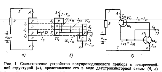 Рис.. Схематическое устройство полупроводникового прибора с четырехслой- ной структурой (а), представление его в виде двухтранзисторной схемы (б, в)