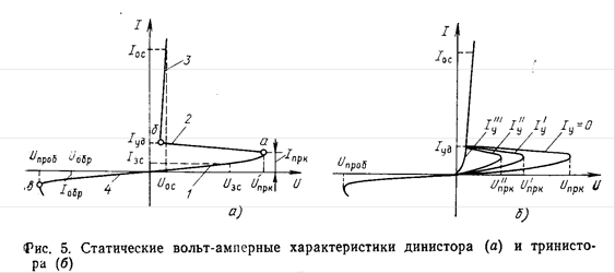 Режим работы динисторов и тринисторов хорошо иллюстрируется их 'статическими вольт-амперными характеристиками, из которых можно получить представление об основных параметрах этих приборов. На рис. 5,а приведена типовая вольт-амперная характеристика динистора. Здесь по горизонтальной оси .отложено напряжение и между его анодом и катодом (анодное напряжение), а по вертикальной-ток I, протекающий через прибор. Область характеристики при положительных анодных напряжениях образует прямую ветвь, а при отрицательных - обратную ветвь характеристики. На характеристике можно выделить четыре участка, обозначенные на рис. 5,a арабскими цифрами, каждый из которых соответствует особому состоянию четырехслойной полупроводниковой структуры.