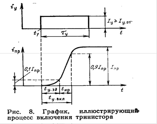 кающего в цепи управления, удовлетворяет приведущему условию , то тринистор переключится в открытое состояние. Обычно для надежного включения достаточно через цепь управляющего электрода пропустить ток