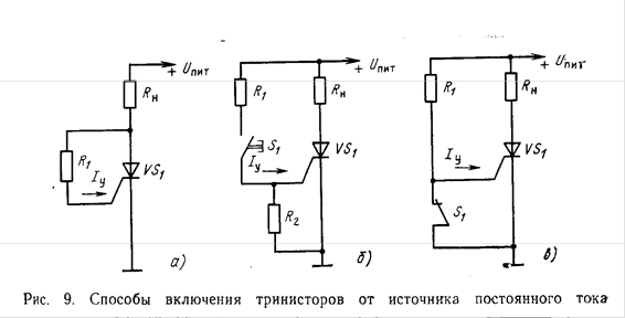 В схеме рис. 9а тринистор включается сразу при подаче анодного питания, если суммарное сопротивление анодной нагрузки и резистора R1 обесточивает ток управляющего электрода