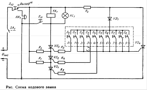на схеме соединении управляющих электродов тринисторов с кнопками кодом замка является число 430, и поэтому первой должна быть нажата кнопка .S4, затем-кнопка S3 и последней-кнопка S 0 . Сопротивления резисторов R1 и R2 обеспечивают выполнение условия Iпр>Iуд, поэтому после включения тринисторов VS1 и VS2 при кратковременном нажатии кнопок S4 и S3 соответственно эта приборы остаются в проводящем состоянии. После нажатия кнопки S0 включается тринистор VS3, напряжение источника питания Uпит через замкнутые контакты выключателя SA1 и кнопки S10 подается на обмотку электромагнита YA1, при этом одновременно загорается сигнальная лампа HL1. Электромагнит втягивает сердечник и таким образом открывает замок двери. При открывании двери контакты выключателя SA1 размыкаются и разрывают цепь питания, тринисторы вновь выключаются, и после закрывания двери устройство возращается в исходное состояние .