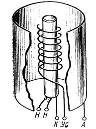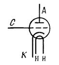 Для того чтобы увеличить возможность управления потоком электронов, эмиттированных . катодом, тем самым расширить область применения электронных ла.мп, были созданы трехэлектродные лампы — триоды. В триоде (рис. 1) между анодом А и и катодом К, помещен еще один электрод — управляющая сетка УС . Сетка конструктивно представляет собой либо спираль, либо сетку из переплетенных проводов, и выполняется из вольфрамового, никелевого или молибденового провода. Условное изображение триода в схеме дано на рис 2. Как и в диоде, в триоде имеются цепь накала для разогрева катода и цепь анода для получения ускоряющего поля для электронов. Глав ное отличие триода от диода в том, что в триоде имеется дополнительная возможность управления анодным током путем изменения нап ряжения между сеткой и катодом