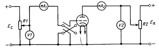 Итак, анодный ток триода является функцией двух переменных .величин — анодного напряжения U а и сеточного напряжения U с. Зависимости анодного тока I а от одного из этих напряжении при постоянном другом напряжении и представляют собой семейства статических характеристик триода. Схема для снятия этих характеристик показана на рис.3