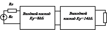 Учитывая то, что каскад с общим эмиттером позволяет получать усиление до 20 дБ, оптимальное число каскадов данного усилителя равно двум. Предварительно распределим на первый каскад по 8 дБ, а на второй каскад 12 дБ. Таким образом, коэффициент передачи устройства составит 20 дБ требуемые по заданию.