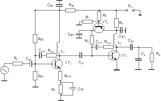 Структурная схема, представленная на рисунке 3.1, содержит кроме усилительных каскадов цепи отрицательной обратной связи, источник сигнала и нагрузку.