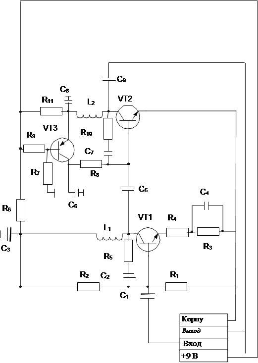 Наибольшей широкополосностью, при работе на ёмкостную нагрузку, обладает усилительный каскад с параллельной отрицательной обратной связью по напряжению. Он и был выбран в качестве выходного каскада разработанного широкополосного усилителя мощности. Так же по сравнению с обыкновенным резистивным каскадом выбранный вариант более экономичный. Для компенсации завала АЧХ в области верхних частот при применении резистивного каскада пришлось бы ставить в цепи коллектора очень малое сопротивление порядка 6 [Ом], для уменьшения общего выходного сопротивления каскада, что естественно привело бы к увеличению тока в цепи коллектора и рассеваемой мощности, а соответственно и к выбору более дорогого по всем параметрам транзистора. Для выходного, каскада была использована активная коллекторная термостабилизация. Обладающая наименьшей, из всех известных мне схем термостабилизаций, мощностью потребления и обеспечивающая наибольшую температурную стабильность коллекторного тока. В результате предложенного решения на первом каскаде, добились усиления в 8 [дБ] с искажениями составляющие 1[дБ]. В качестве предоконечного использован каскад с комбинированной обратной связью [2], обладающие активным и постоянным в полосе пропускания выходным сопротивлением. Этот каскад реализован на транзисторе малой мощности КТ 371 А и так же, как и предыдущий обладает большей полосой частот. Данный каскад менее мощный поэтому для обеспечения требуемой температурной стабилизации вполне подошла эмиттерная стабилизация. В результате на втором каскаде, добились усиления 12 дБ.