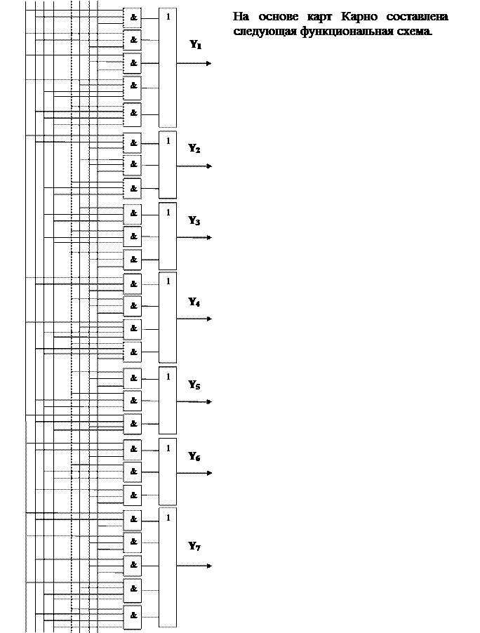 На рисунке в виде “черного ящика” показана комбинационная схема (КС) управляющая семисегментным индикатором. На вход схемы подаются различные комбинации двух сигналов X1 , X2 , X3 , X4 (X1 - старший). На индикатор предполагается выводить лишь отдельные цифры из множества шестнадцатеричных цифр. На выходе Y должна быть единица, если соединенный с этим выходом сегмент должен загореться при отображении цифр (для логической схемы). Требуется: