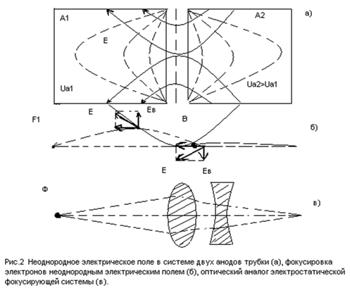 На рисунке 2б), выделена лишь одна электрическая силовая линия и показана траектория электрона, отклоняющегося от оси под небольшим углом и встречающегося с силовой линией в точке А. В этой точке вектор напряженности электрического поля Е можно разложить на горизонтальную Ег и вертикальную Ев составляющие. Согласно соотношению Ег будет ускорять электрон в сторону экрана, а Ев будет прижимать его к оси, то есть осуществлять фокусировку.