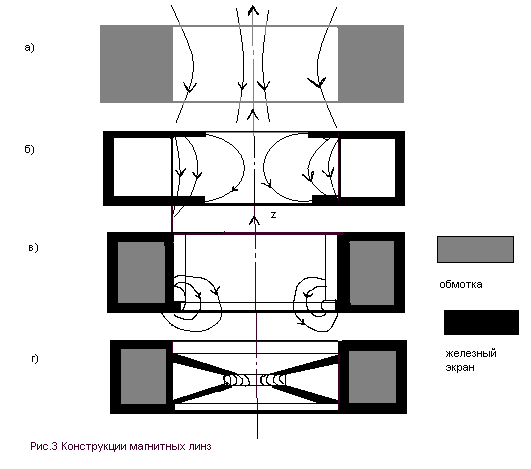 и сжимать поле в осевом направлении. Это достигается с помощью оболочки из ферромагнетика – магнитного экрана (рис.3, б и в) часто снабженного кольцевыми полюсными наконечниками (рис.3, г).