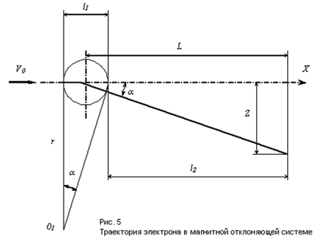 Магнитная отклоняющая система обычно содержит две пары катушек, надеваемых на горловину трубки и образующих магнитные поля во взаимно перпендикулярных направлениях. Рассмотрим отклонение электрона магнитным полем одной пары катушек, считая, что поле ограничено диаметром катушки и в этом пространстве однородно. На рис.1 силовые линии магнитного поля изображены уходящими от зрителя перпендикулярно плоскости чертежа. Электрон с начальной скоростью V0 движется в магнитном поле, вектор индукции B которого нормален к вектору скорости V0 , по окружности с радиусом