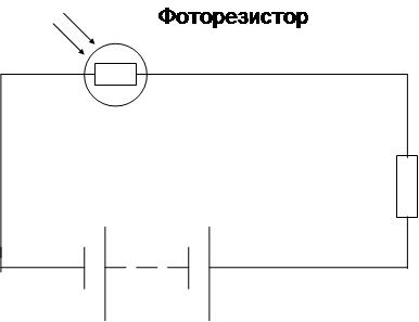 При определенном освещении сопротивление фотоэлемента уменьшается, а, следовательно, сила тока в цепи возрастает, достигая значения, достаточного для работы какого- либо устройства ( схематично показано в виде некоторого сопротивления нагрузки ).