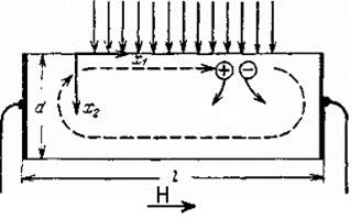 Рис. 1 Возникновение фотоэлектромагнитного эффекта в полупроводниковой пластине, где Н – напряженность магнитного поля, l – длина пластины, d – ее толщина, x1 и x2 - оси координат.