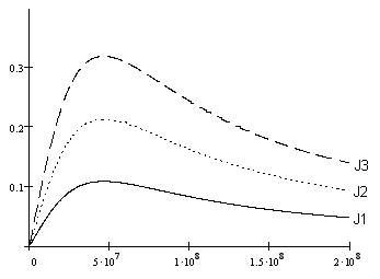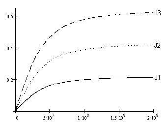 Рис. 2. Семейство зависимостей тока короткого замыкания ФМЭ от магнитного поля при малой скорости поверхностной рекомбинации при различной интенсивности света J, фотонов/м2 ∙с: J1 = 1017 , J2 = 2∙1017 ,