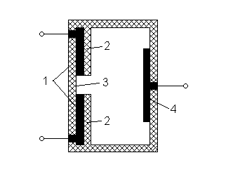 Принцип действия хемотронной ячейки памяти иллюстрирует рис. 2. В герметичном пластмассовом корпусе расположены два пластинчатых электрода 1 из золота или платины. Электроды с внутренней стороны изолированны эпоксидным покрытием 2, за исключением узкого зазора 3, ширина которого не должна превышать 0,1 мм. На противоположной стенке ячейки напротив зазора расположен медный электрод 4. Расстояние между этим электродом и пластинчатыми электродами 1 составляет примерно 0,5 мм. Сопротивление между электродами 1 зависит от наличия раствора электролита в зазоре 3. Если зазор заполнен раствором, то это сопротивление велико. При подаче на электроды 1 напряжения, отрицательного относительно электрода 4, последний начинает растворяться, и в зазоре 3 происходит отложение меди. Через некоторое время (время записи) зазор между электродами 1 будет замкнут осажденной медью и сопротивление между ними резко снизится из-за высокой