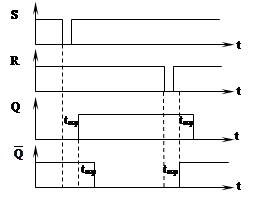 На рис 1.14.3 показаны временные диаграммы переключения RS – триггера с инверсными входами с учетом задержки переключения каждого элемента на tзад.ср. Из временных диаграмм видно, что задержка полного переключения триггера равна 2tзад.ср .
