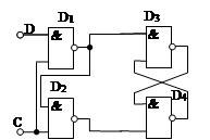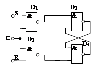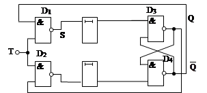 RS – триггер может быть синхронным. В этом случае кроме двух информационных входов S и R триггер имеет еще вход синхронизации. Сигналы на входах S и R лишь подготавливают триггер к нужному переключению, а само переключение происходит только в момент подачи синхронизирующего импульса. Схема такого триггера показана на рис 1.14.4. Синхронизация организуется с помощью двух дополнительных элементов И-НЕ D1 и D2. Элементы D3 и D4 образуют несинхронный (асинхронный) RS – триггер с инверсными входами.
