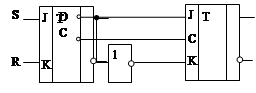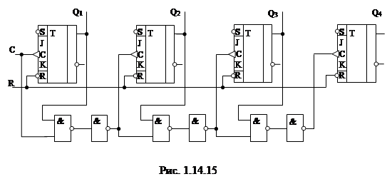 соединить с прямым выходом первого триггера. Если какой либо вход не куда не подключен, это эквивалентно подаче на этот вход единицы. Таким образом, счетчик синтезирован. Его схема показана на рис. 1.14.17.
