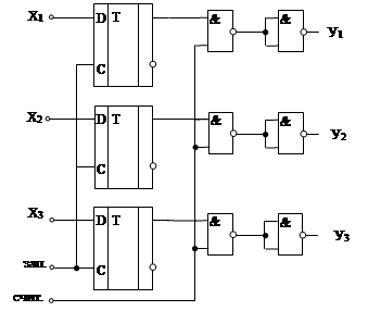 При подаче сигнала «1» на вход «счит» значение разрядов числа с инверсных выходов триггеров поступают на выходы У1 , У2 , У3 через элементы И – НЕ.