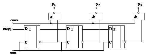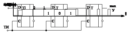 последовательный регистр строится на D – триггерах путем соединения выхода каждого триггера со входом «D» следующего. Для записи и считывания одновременно на входы синхронизации всех триггеров подаются тактовые импульсы «ТИ» рис 1.14.10