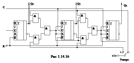 Связи между триггерами реверсивного счётчика соответствуют как суммирующему, так и вычитающему счётчику, но работает только одна из связей, которая определяется командой «Реверс» и подается на элемент И–НЕ, включенные в цепи передачи сигнала переноса. Схема реверсивного счётчика показана на Рис 1.14.16.