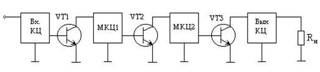 Число каскадов для любого усилителя выбирается исходя из того, какой коэффициент усиления должно обеспечивать заданное устройство. Для того чтобы обеспечить коэффициент усиления 30дБ необходимо соединить последовательно три усилительных каскада, так как одним каскадом невозможно достичь такого усиления, который может выдать примерно 10-12дБ.