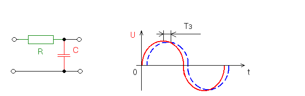 В любой цепи, содержащей накопители энергии, максимальные значения мгновенных выходных напряжений сдвинуты по времени относительно аналогчных максимальных входных напряжений. Например в нижеприведенной схеме выходное напряжение отстает по фазе от входного, из-за чего между этими напряжениями образуется сдвиг во времени. Такое время задержки называют групповым.