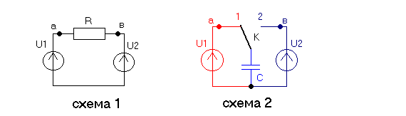 Пусть имеется схема 1, если U1 > U2, то по цепи потечет ток от точки а к точке в. Заменим теперь схему 1 схемой 2. переключатель К в некоторый момент переведём из положения 2 в положение 1. Поскольку напряжение на конденсаторе отлично от напряжения U1, конденсатор станет заряжаться и в ветви первого источника потечет ток, также, как он протекал в схеме 1. После переключения ключа в положение 2, конденсатор станет разряжаться и в проводнике в окажется ток. Эти переключения производят с достаточно большой частотой, которую называют тактовой. В качестве переключателя используют специальное электронное устройство, не содержащее резисторов.